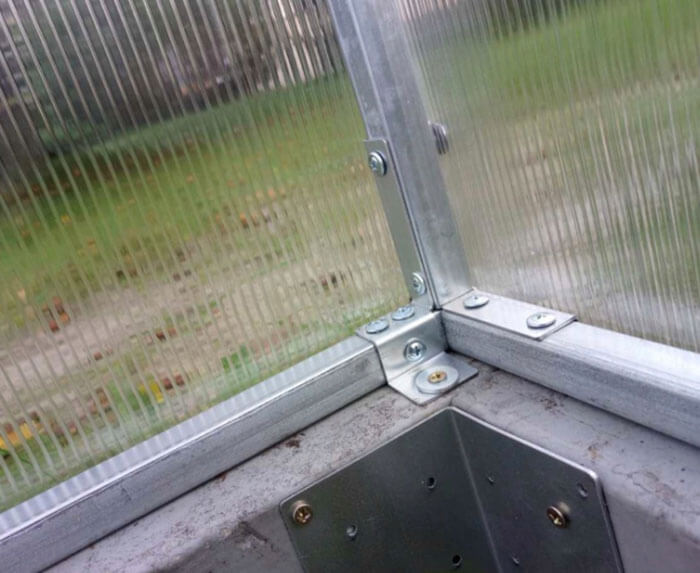 Se livrează cu policarbonat celular de 4 mm 600g/m2. Policarbonatul de pe acoperișul serei este fixat cu benzi de metal galvanizate și un suport special de întindere.